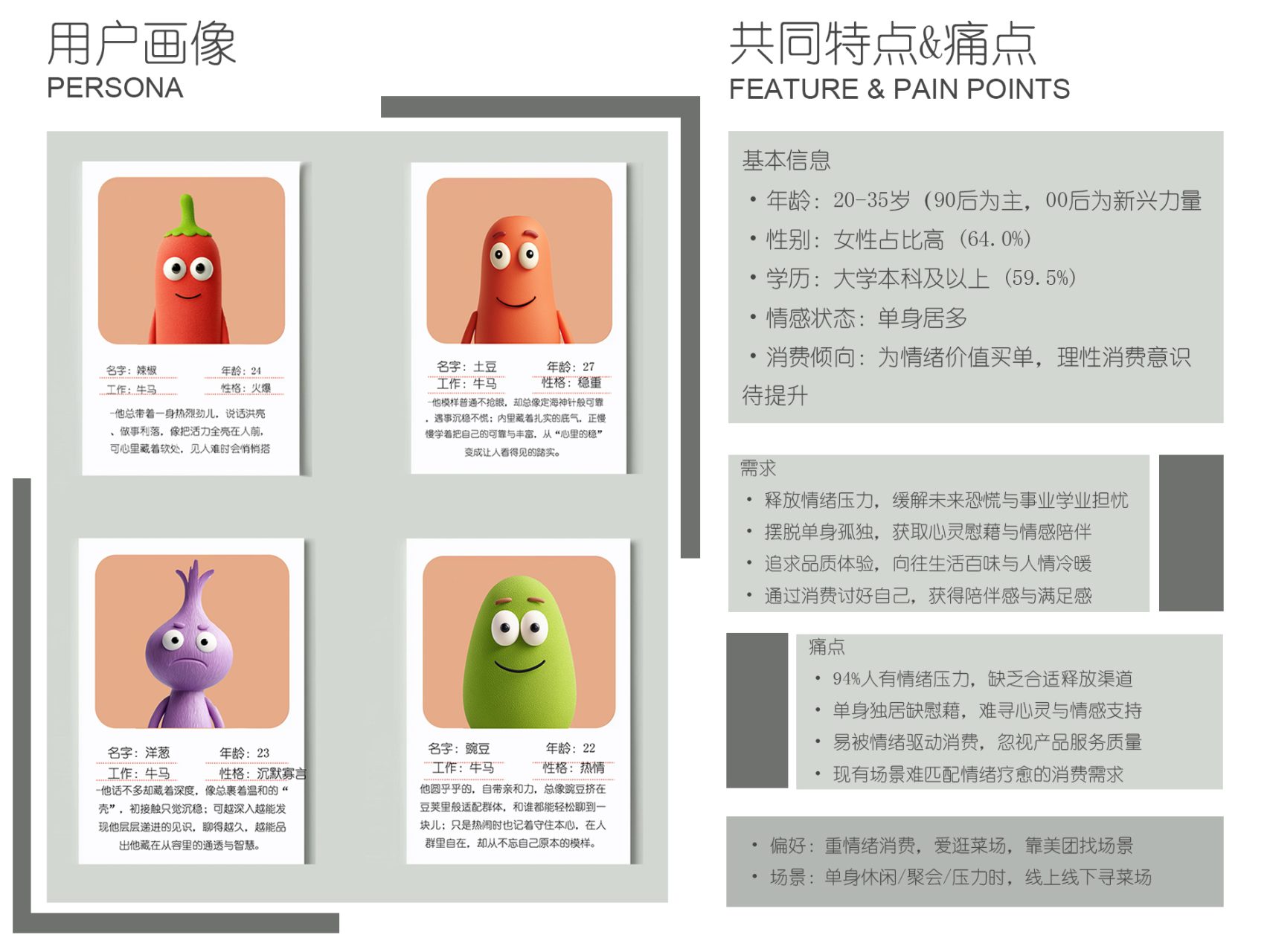 以20-35岁的年轻群体为主体,涵盖职场新人、年轻白领等90后、00后,以及本科及以上学历的高知人群。他们日常需在“职场专业”“社交得体”“家庭懂事”等角色间切换,习惯用“伪装”适配不同场景,同时拒绝内卷,渴望在生活里找到能安放真实情绪的出口,对兼顾“角色适配”与“情绪价值”的产品需求强烈。