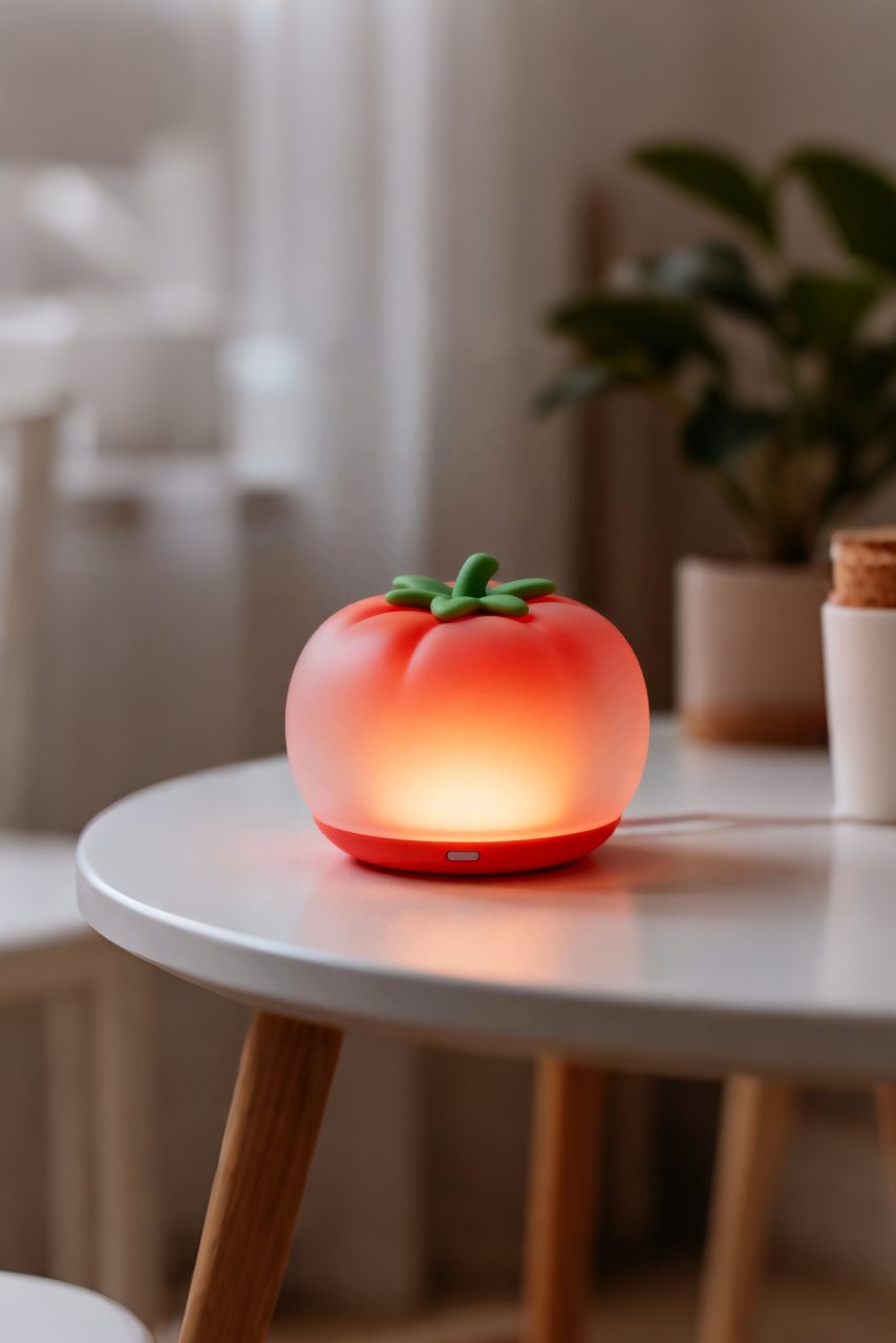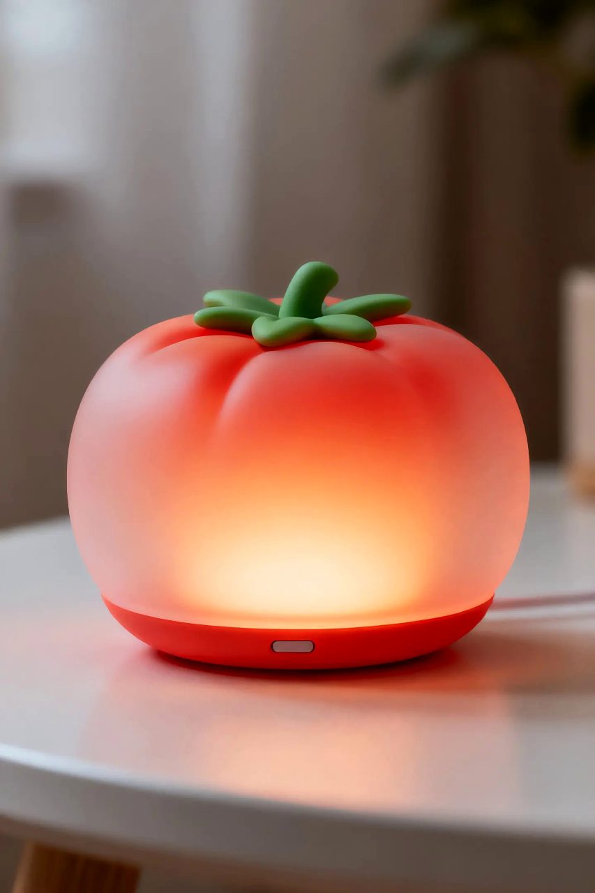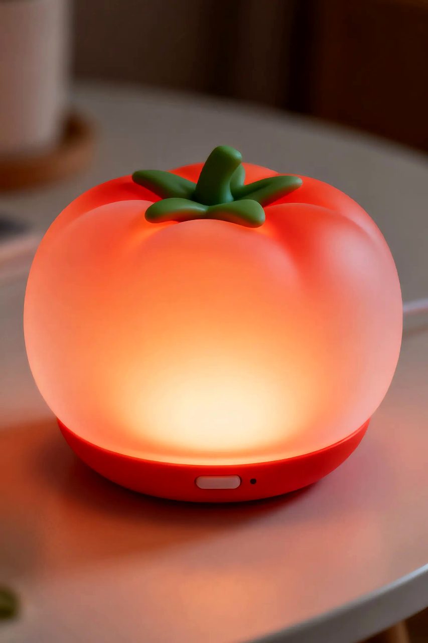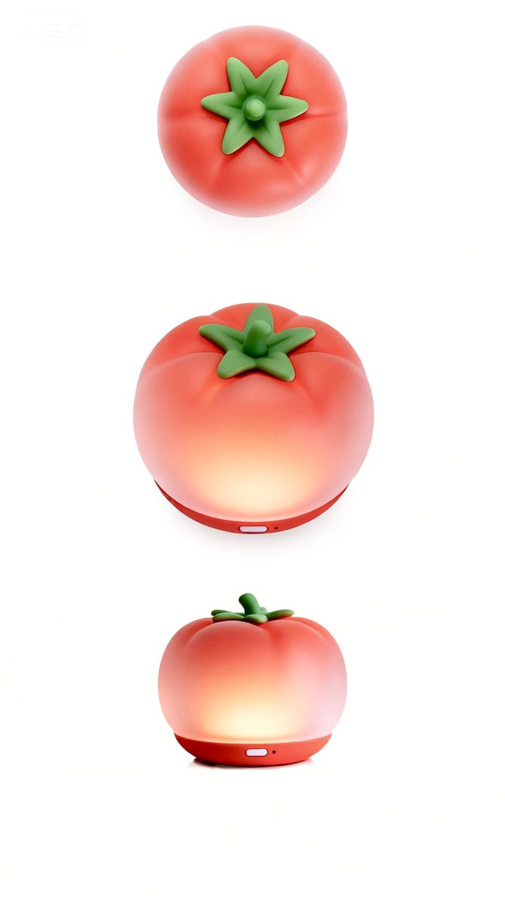 这是一款桌面智能感应灯,外形如一颗饱满的番茄,轻拍即亮,光线温暖柔和。通过光影交互将专注工作的成就感转化为即时、可见的喜悦与满足。