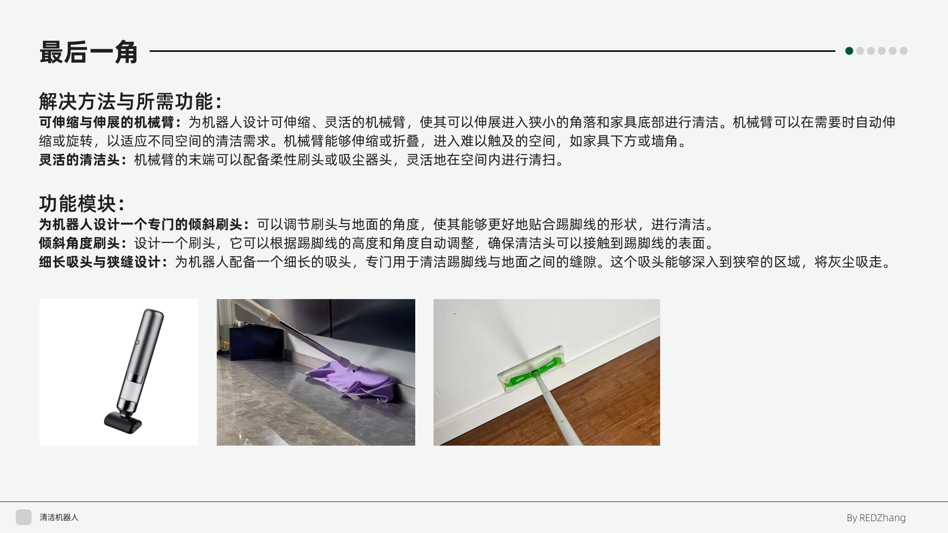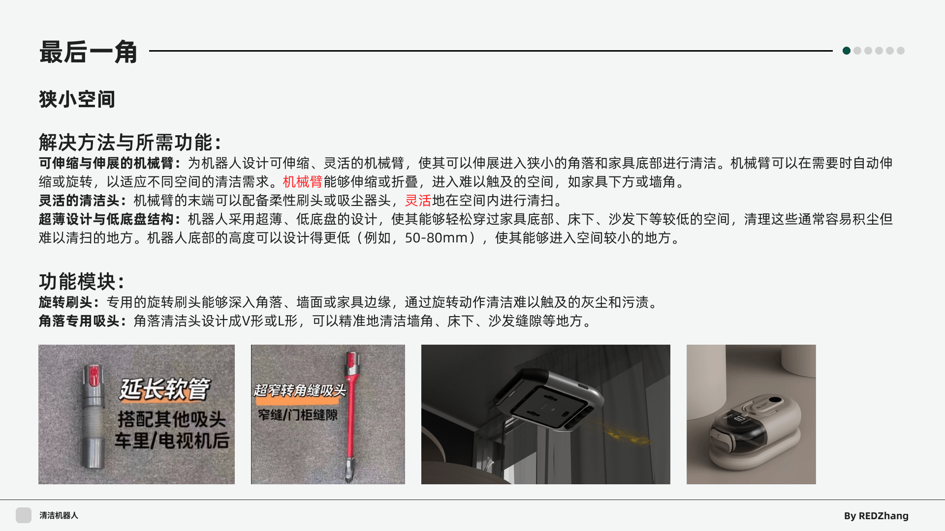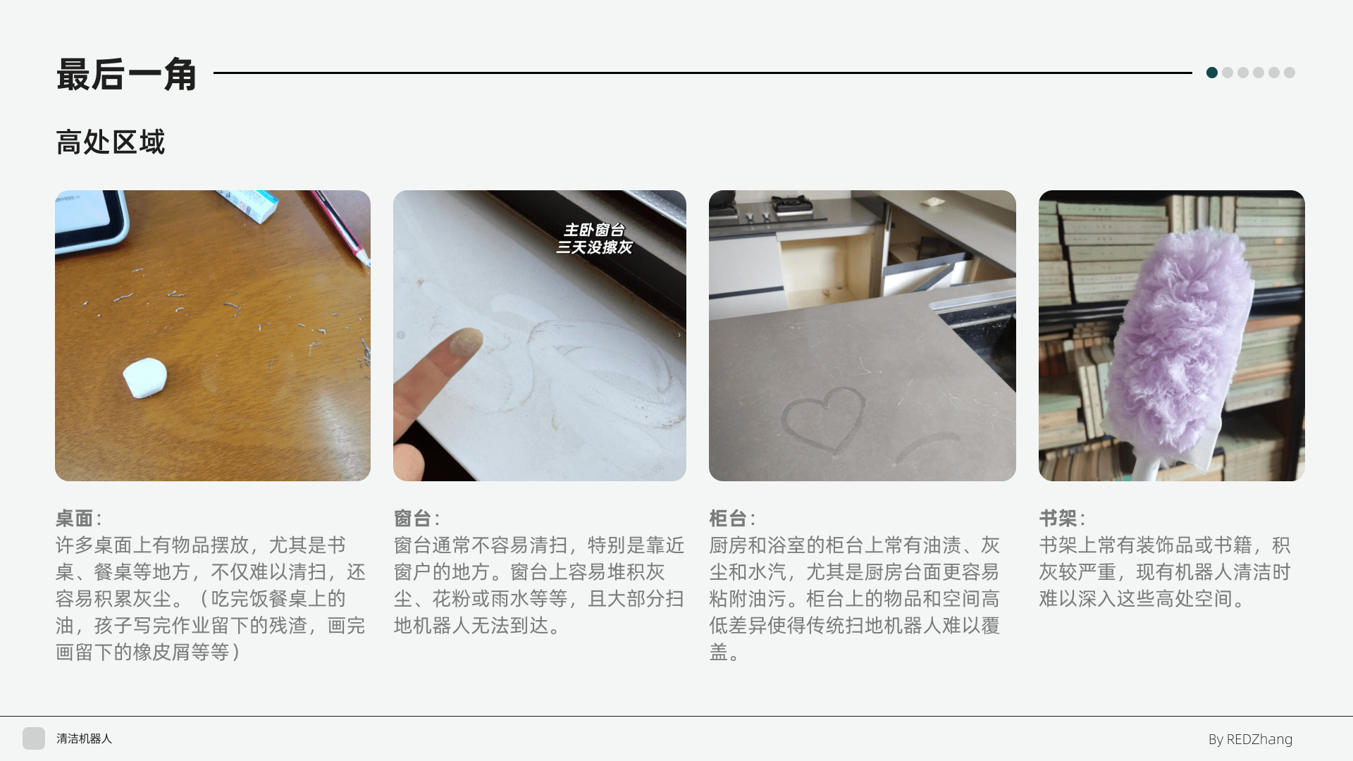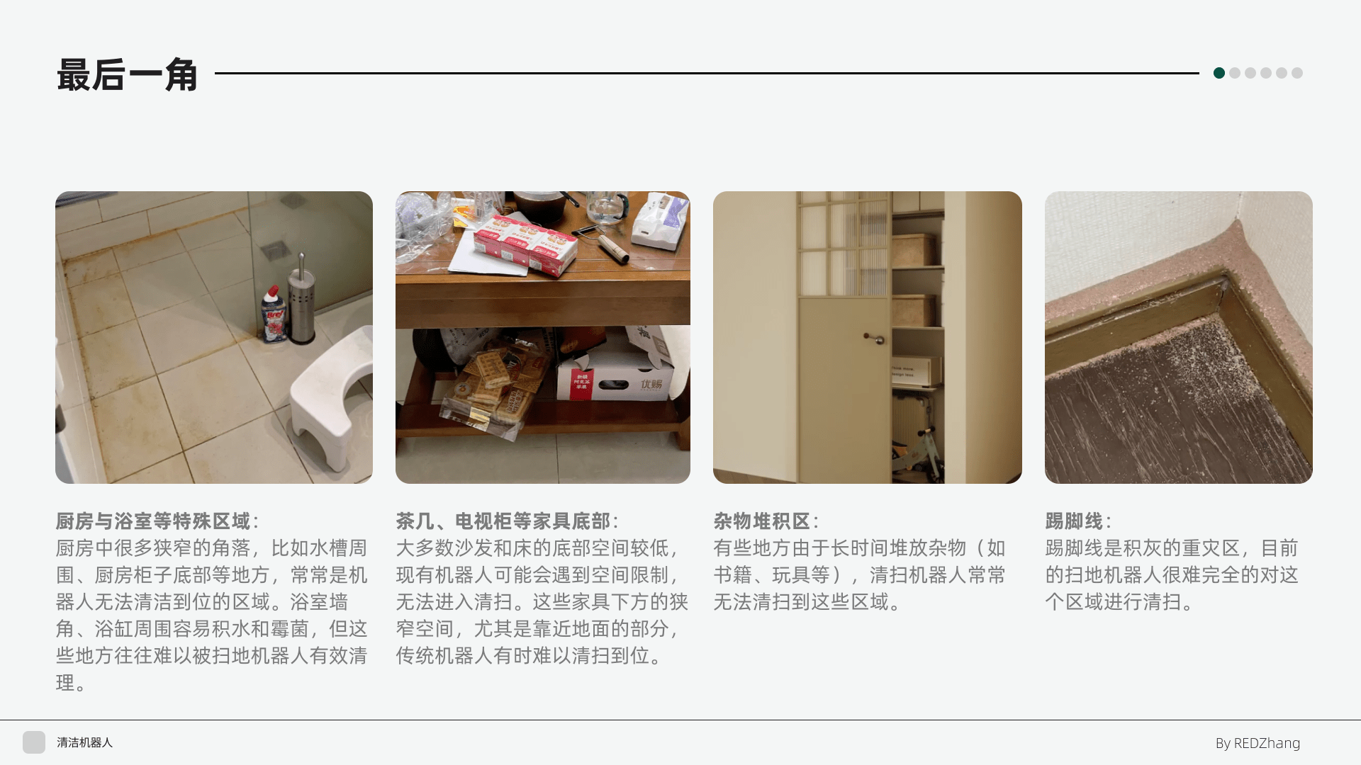 在不断的减法之下,我将方向聚焦于家庭空间中,现有的清洁机器人难以打扫的最后一角。将其整理列出,找出现有的解决方法与所需功能,以及市场上现有的产品与功能模块,结合思考。