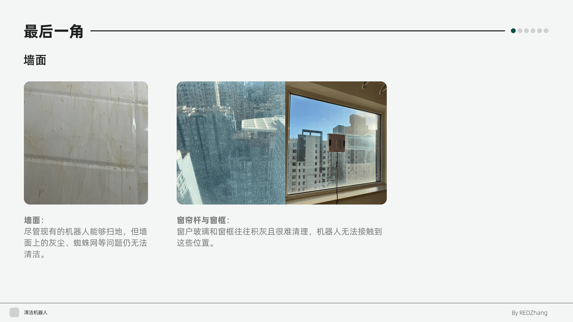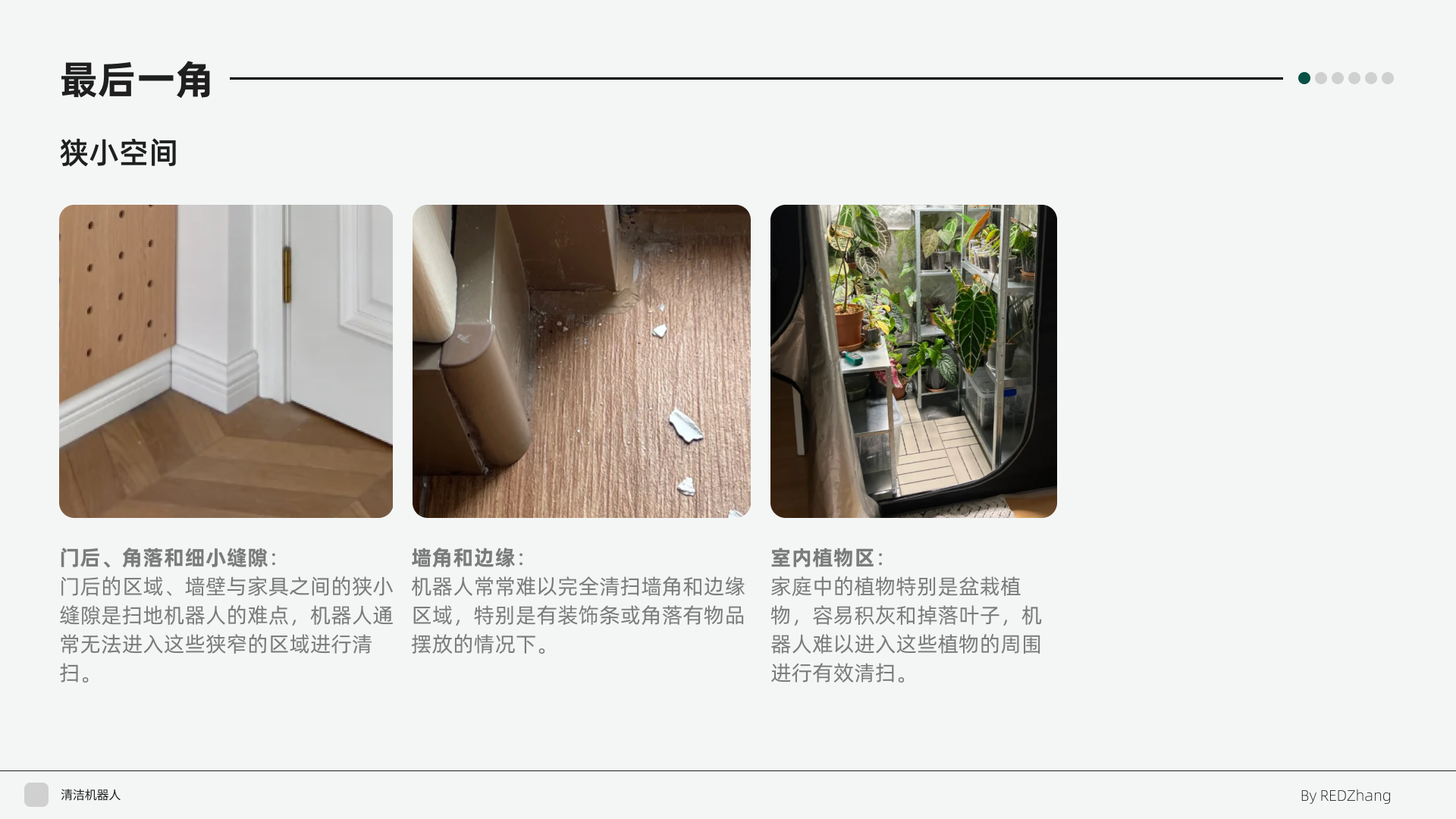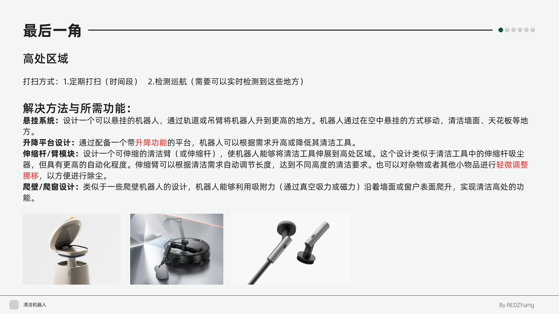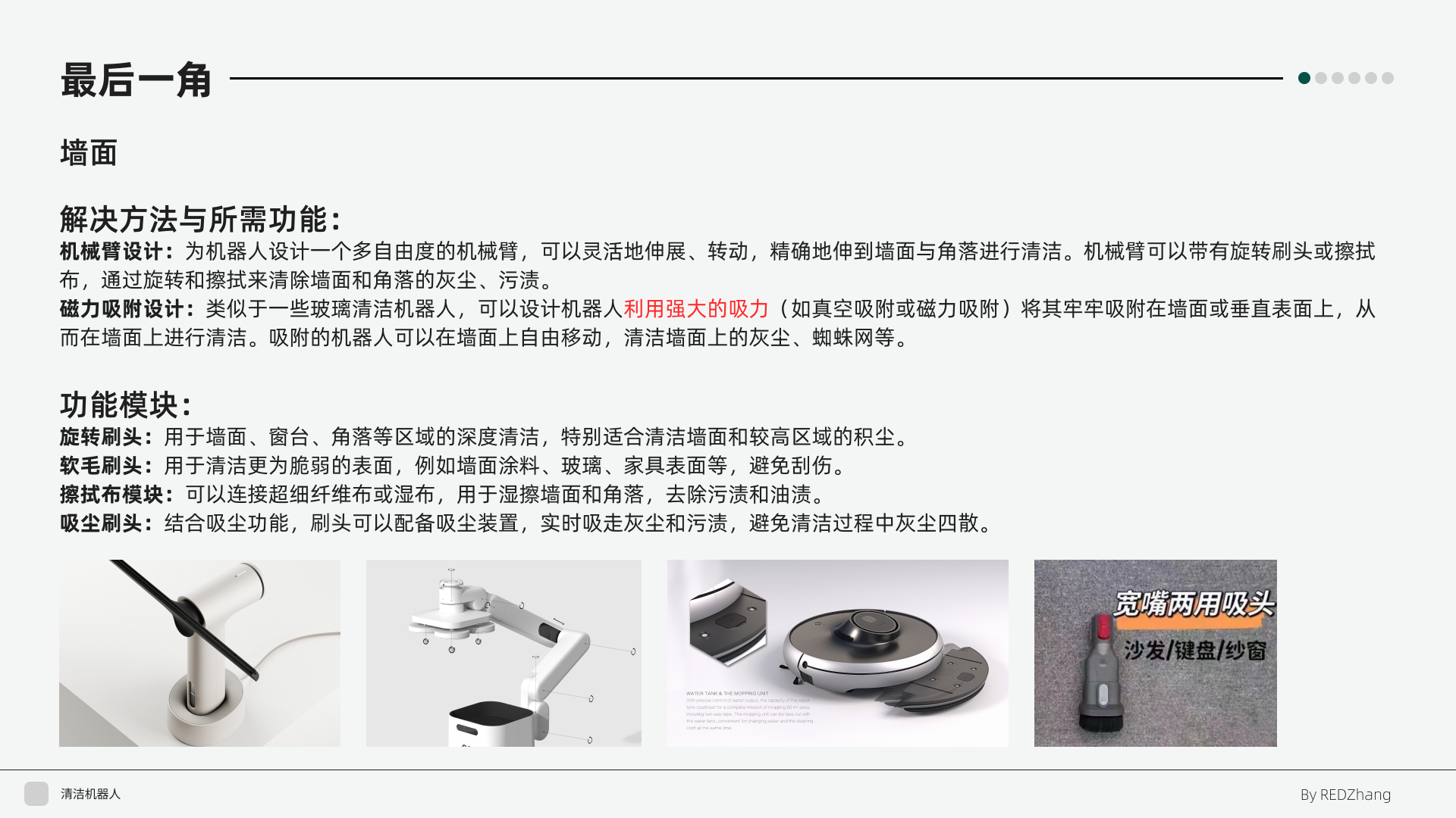 在不断的减法之下,我将方向聚焦于家庭空间中,现有的清洁机器人难以打扫的最后一角。将其整理列出,找出现有的解决方法与所需功能,以及市场上现有的产品与功能模块,结合思考。