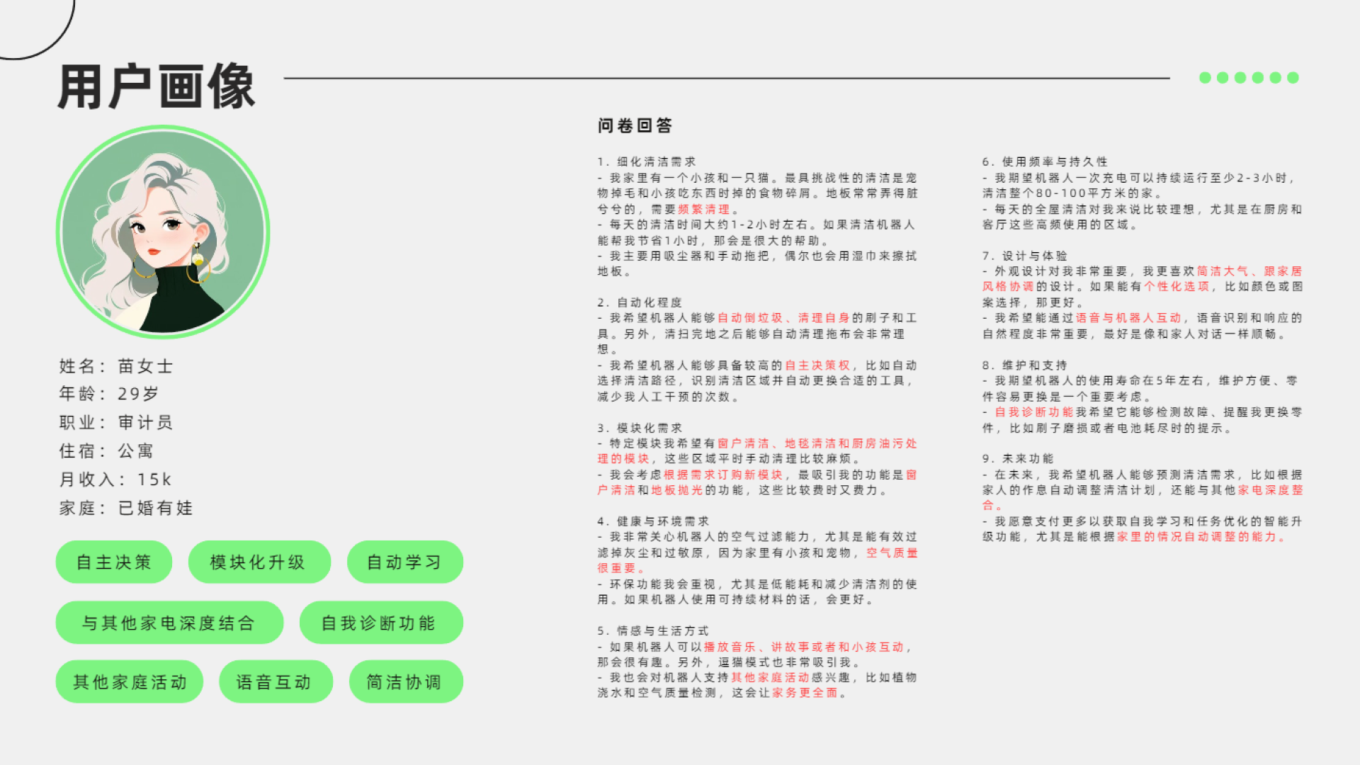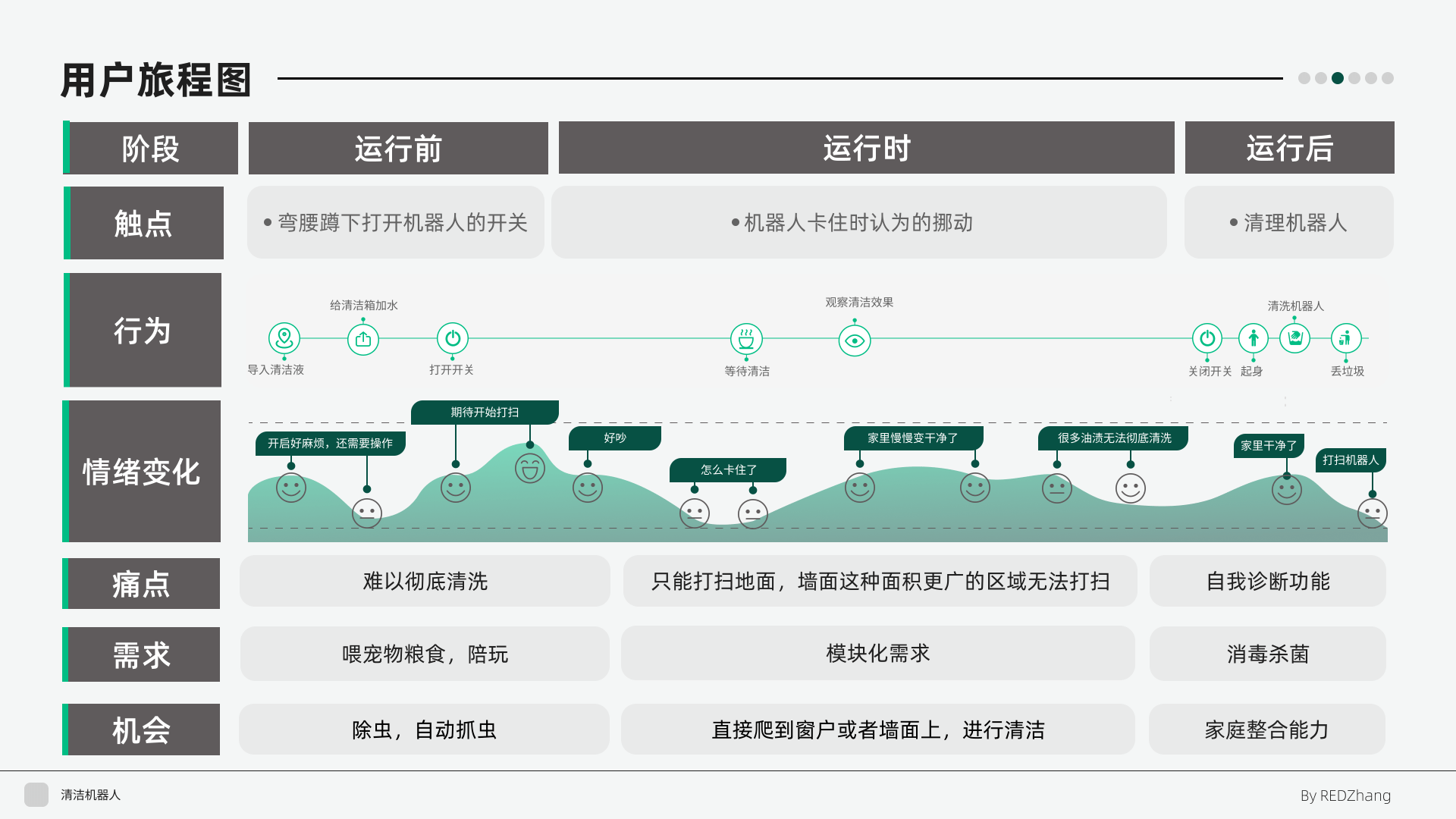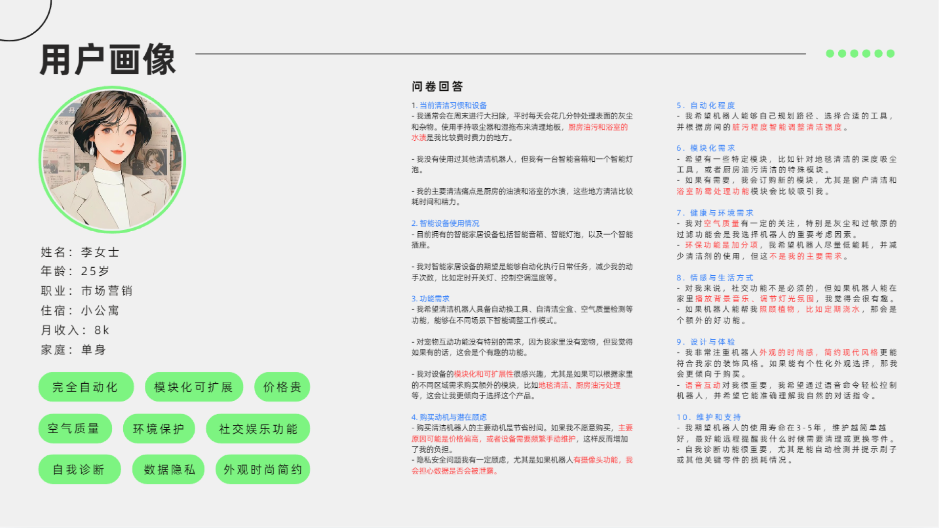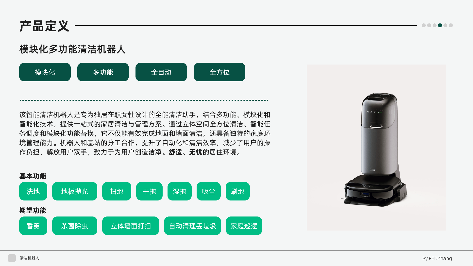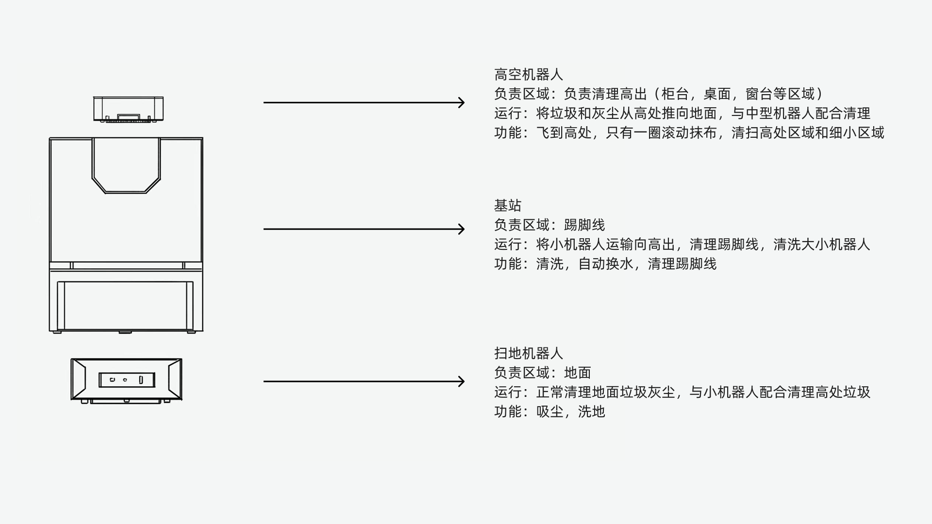 用户定期清洁扫地机器人的刷子、传感器、轮子等维护工作繁琐。如果长时间不维护,设备的清洁效率会恢复,持续一个周期。扫地机器人扫完了地,用户很多时候也没法歇着,要清理尘盒,倒污水,还要洗晒拖布。(解放用户的双手,留出更多的个人空间)
