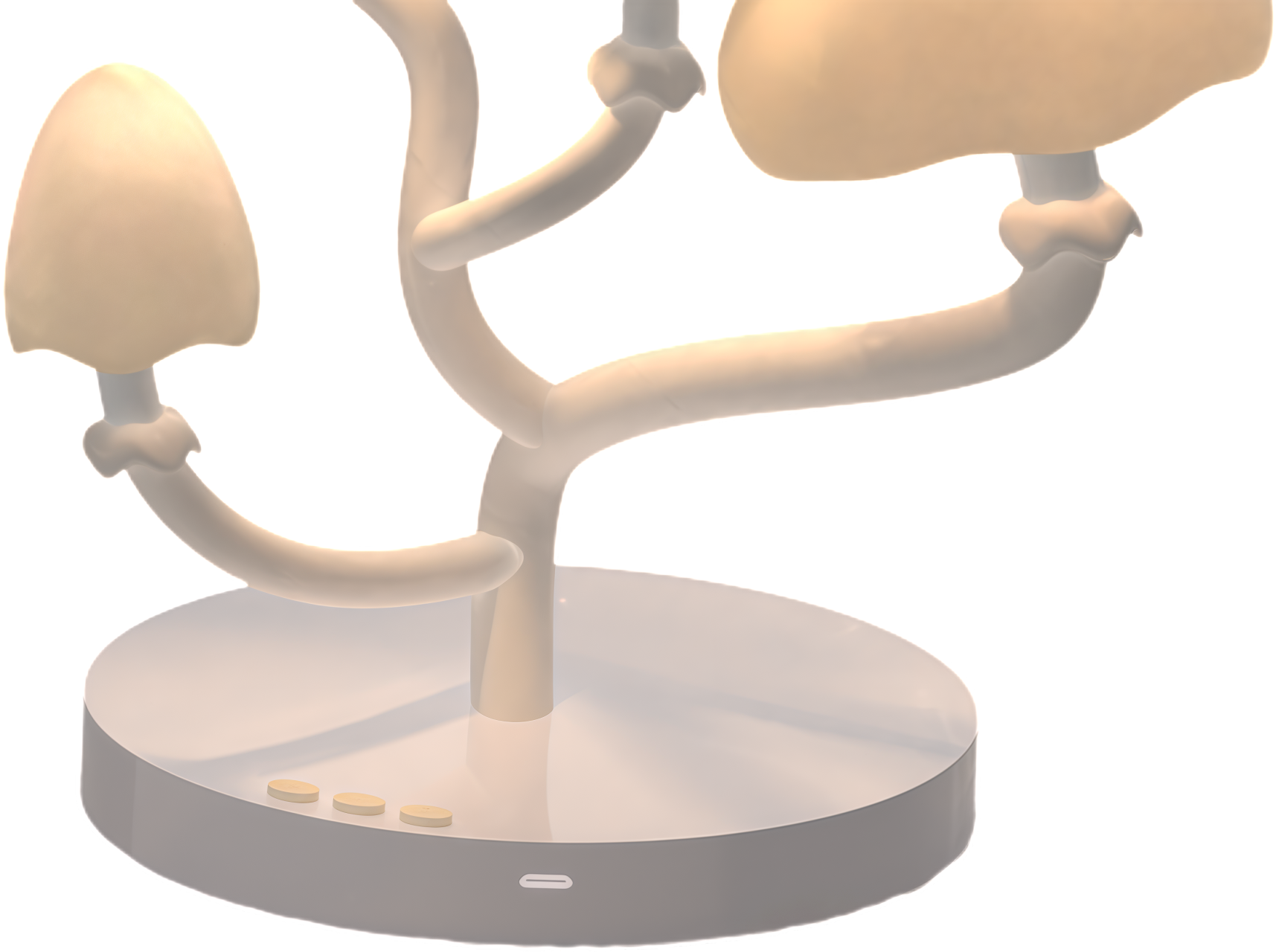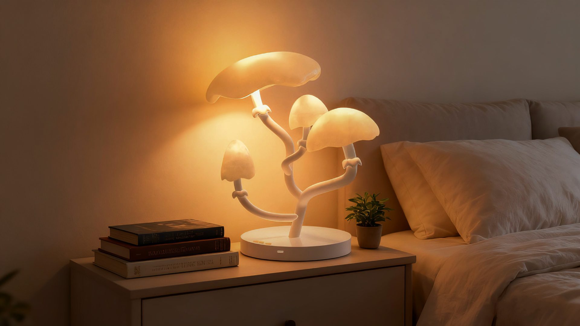 本款蘑菇伴居灯以自然中灵动的蘑菇为设计原型,从自然意象中提取“蘑菇群落”的生长感与陪伴感。采用“呼吸式光亮此起彼伏”的光效设计,不同蘑菇灯体的亮度、明暗节奏错落交替,如同生命体的呼吸韵律。各蘑菇灯体与枝干采用可拔插的连接方式,独居人士在起夜时,可将任意蘑菇灯体从连接处取下,作为手持小夜灯使用,为夜间路径提供局部照明。还模拟“摘取蘑菇”的生活仪式感,为每盏蘑菇灯体设置“拍拍亮”触发机制。让照明交互从“按键操作”升级为“自然动作的情感互动”,在趣味操作中强化人与产品的情感连接。