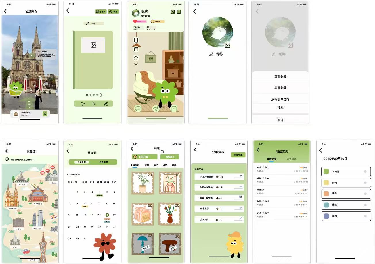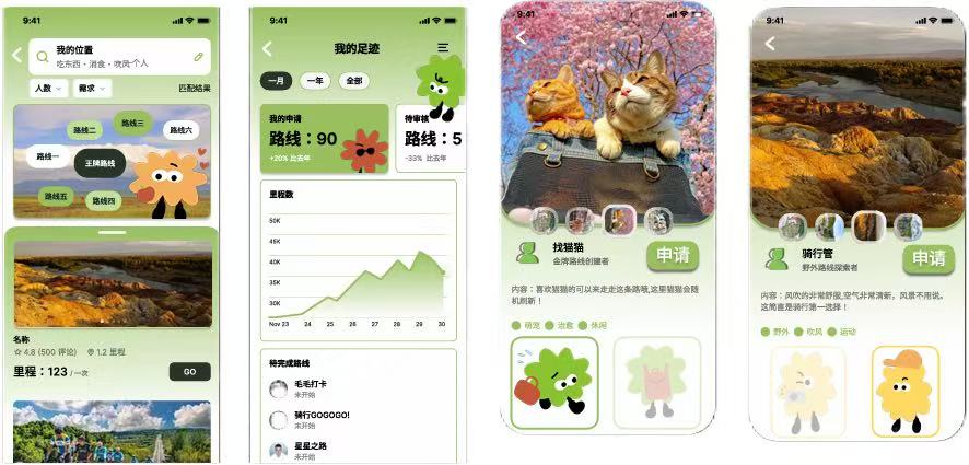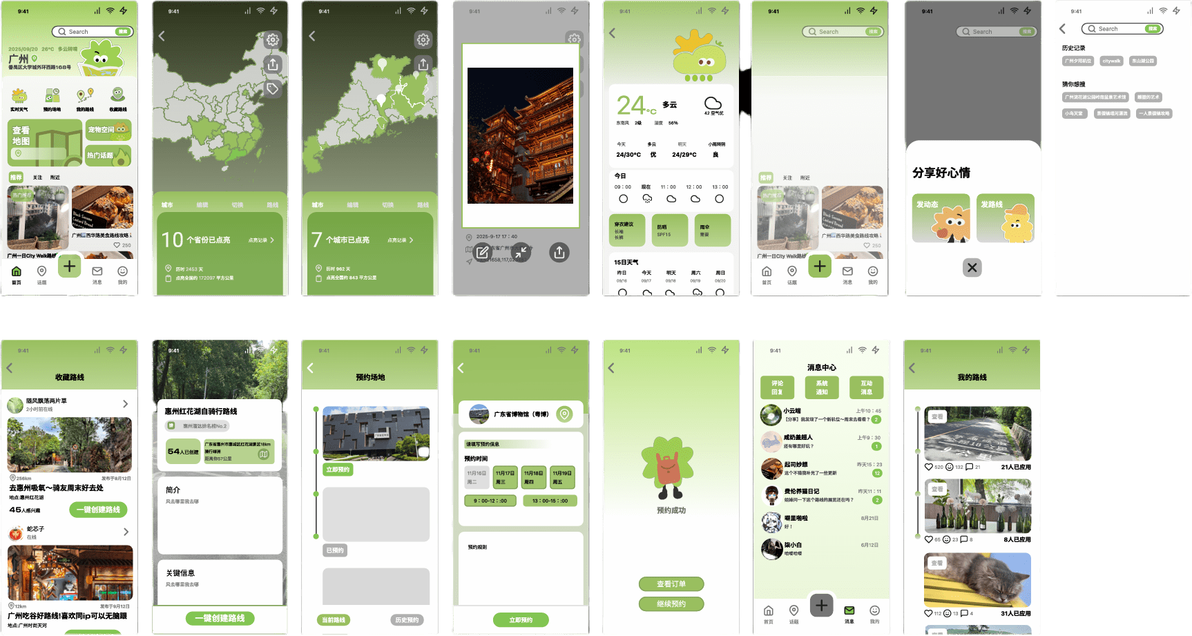 UI部分我们主要设计了三大板块:信息整合板块,虚拟宠物陪伴空间,以及路线置换所。